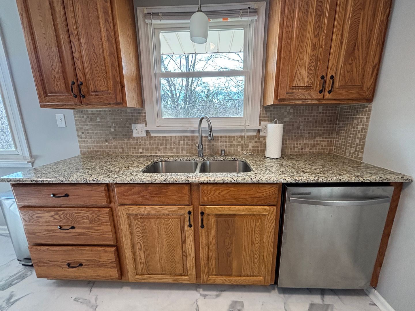 Both full bathrooms have been tastefully renovated with new cabinetry and countertops, delivering a polished, contemporary look. New lighting throughout the home enhances every space with a warm, modern touch.