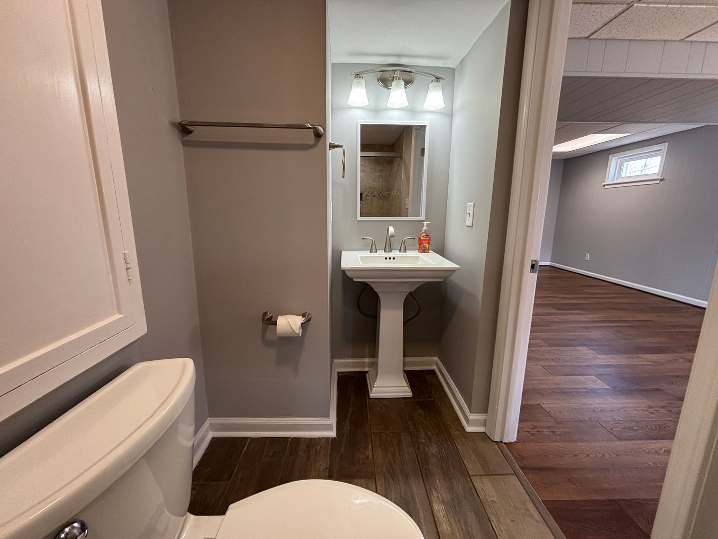 The lower-level living area also features new luxury vinyl plank flooring, providing flexible space perfect for relaxing, entertaining, or creating a home office or recreation area.